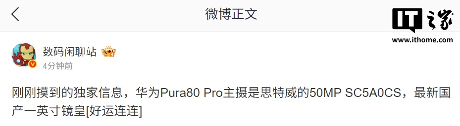 IT之家 5 月 26 日音信,博主 @数码闲道站 当天发布爆料音信称,华为 Pura80 Pro 主摄是念念特威的 50Mp SC5A0CS,最新国产一英寸镜皇。