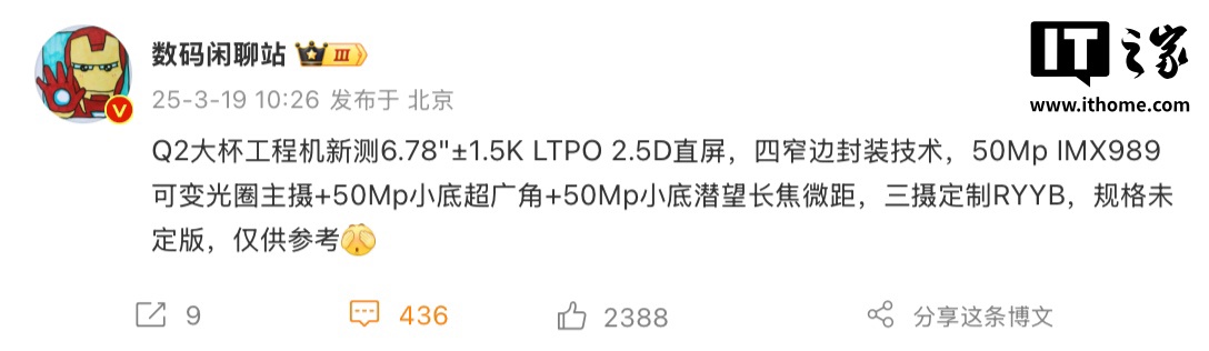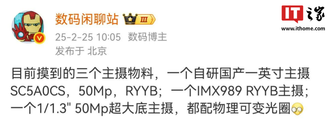 在录像头方面,该机此前被曝将搭载 50Mp IMX989 可变光圈主摄 + 50Mp 小底超广角 + 50Mp 小底潜望长焦微距,三摄均为定制 RYYB。不外相应手机规格尚不决版,并不成代表最终实机情况。