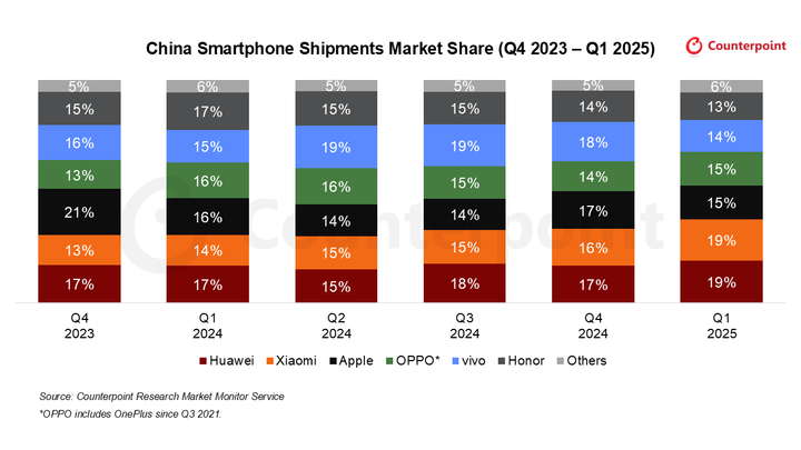 据分析机构 Counterpoint 最新数据自满,2025 年第一季度的中国智高手机阛阓出货量同比增长了 5%,其中: