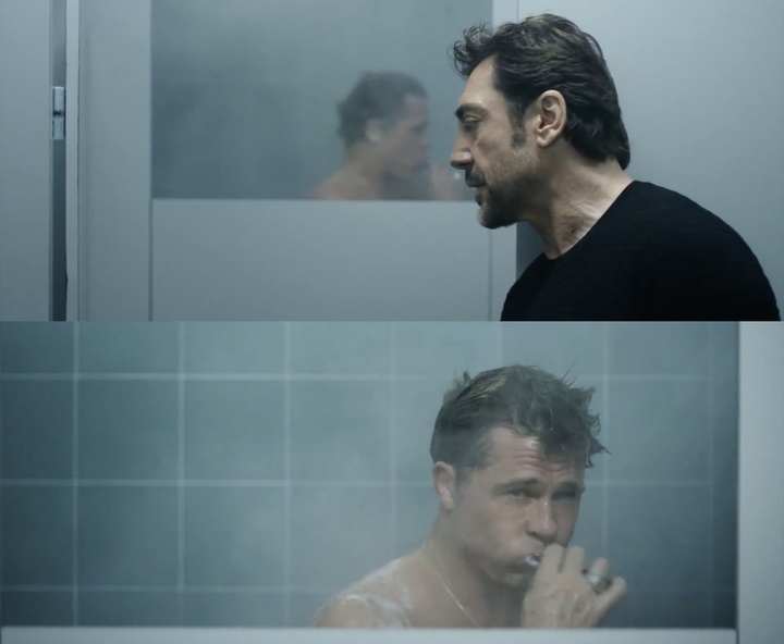 片中,布拉德·皮特与哈维尔·巴登边洗沐边交心——处境费事的 F1 车队的领头东谈主努力劝服「老骥伏枥」的车手。